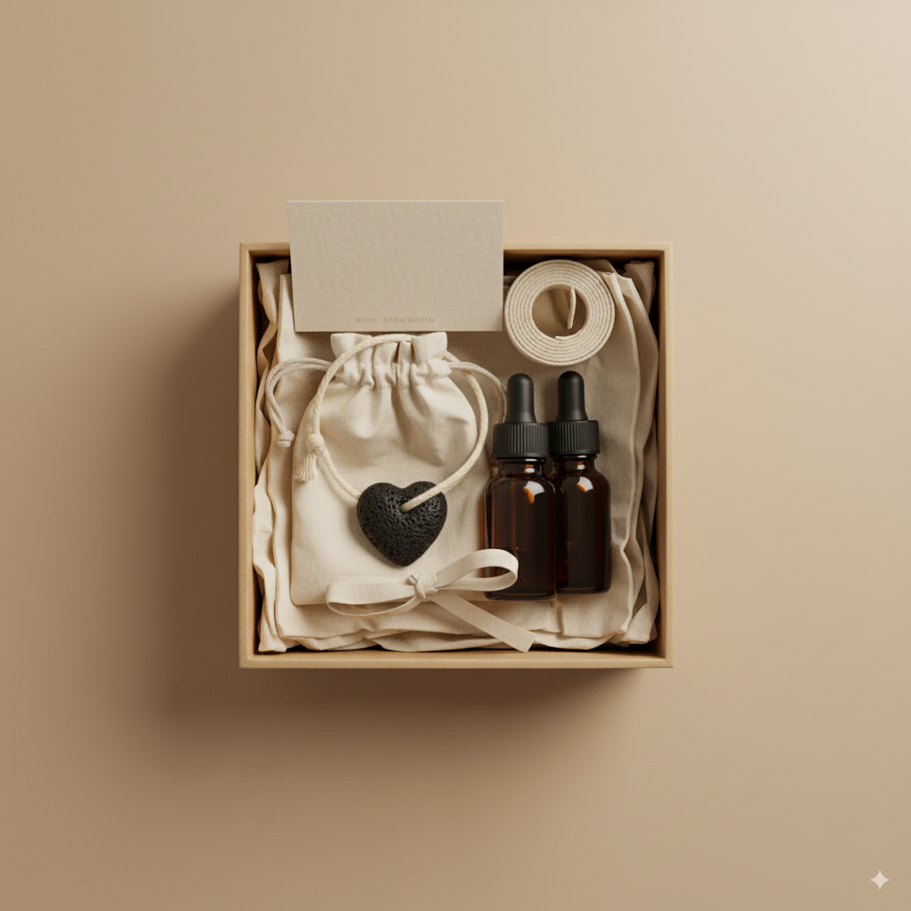 Pack regalo aromaterapia con colgante de lava, dos sinergias y estuche premium. Un detalle con significado, listo para sorprender.